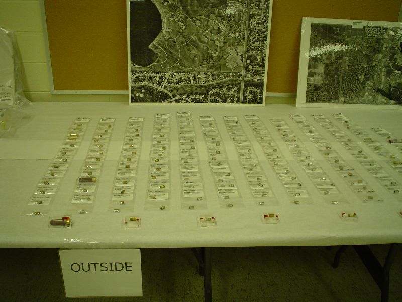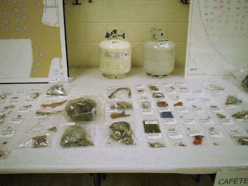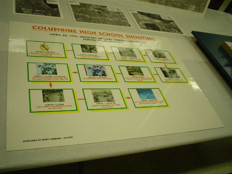 The new Sheriff wanted to demonstrate that everything they had was being made available. It was pretty overwhelming. There were two large rooms full of materials–everything from propane tanks to bomb and bullet fragments, the infamous trench coats the killers wore, shot-by-shot (literally) diagrams of the crime scene, bullet casings, videos, and much more. We could look but obviously could not touch. Written volumes of reports were displayed but could not be read. Some materials are closed by court order.